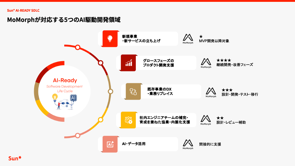 Sun*は今後も、新規サービス/プロダクトの開発やプロダクトのグロース、レガシーシステムのモダナイゼーション・内製化など、クライアント企業の幅広い課題解決を目指し、「MoMorph」を通じたAI駆動開発によって支援していきます。