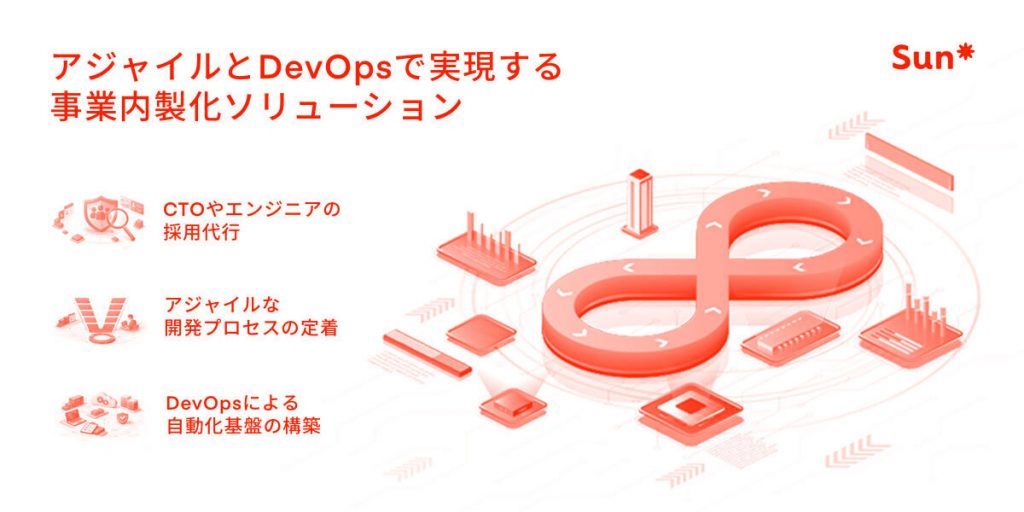 本ソリューションは、自社でプロダクトを成長させ続ける力の獲得を支援する内製化支援サービスです。組織・プロセス・技術の3軸からアプローチし、内製化の壁となる「開発カルチャー」「人材不足」「開発スピード」の課題を解消します。具体的には、CTOやリードエンジニアの採用代行から、アジャイルな開発プロセスの定着、DevOpsによる自動化基盤の構築までをパッケージ化して提供します。単なる開発代行に留まらず、最終的には外部に依存せず、自社主導で高速に価値創出を繰り返せる「持続可能な開発組織」への変革をSun*がご支援します。