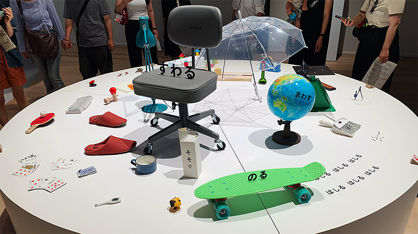 本展のテーマは「行為(動詞)」。あるく、たべる、すわる、など日常の何気ない動作をデザイン視点から再発見することができます。子どもから大人まで楽しめる、35点の体験型展示を行っています。