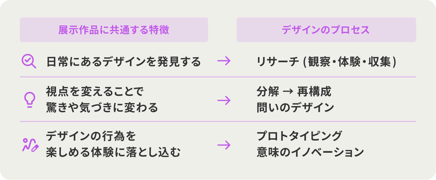 「あるく」「たべる」「もつ」などの行為を観察し、分類し整理する。さらに分解、再構成することで、これまで気づかなかった “意味” や “価値”が見えてきます。そして、それらをただ情報として見せるのではなく、遊びのある体験へ落とし込んでいく。それらはすべてデザインの行為であり、デザインのプロセスであることに気付かされます。