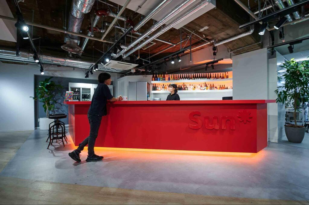 Sun*オフィスには、メンバーが集まり、様々なコミュニケーションが交差する場の象徴としてバーカウンターがあります。