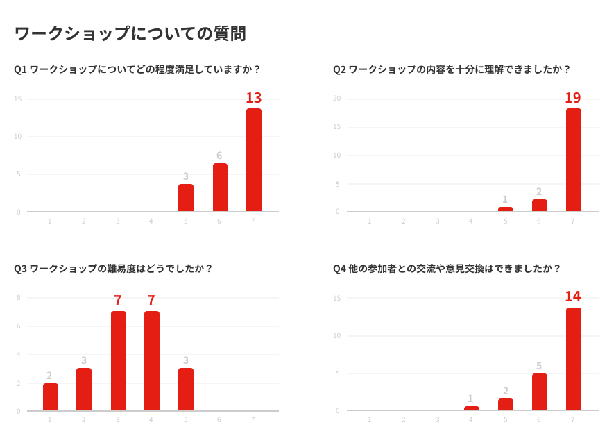 内定式終了後、内定者の皆さんにはワークショップについてアンケートに回答していただきました。「満足度」「理解度」「難易度」「参加者同士の交流」の4つの指標で評価をお願いしたところ、高い満足度・理解度が得られ、適切な難易度で十分な意見交換ができたという結果になりました。