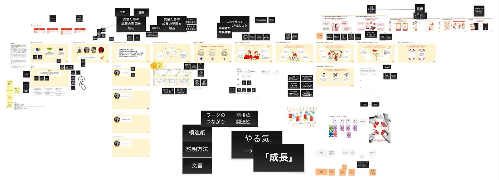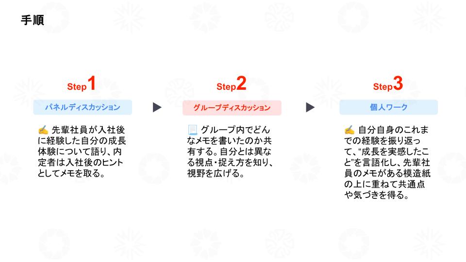 リハーサルを2回、3回と重ねる中で、人事の新卒内定チームやデザイナーのメンバーから都度フィードバックを受け、ワークショップ全体の流れをブラッシュアップしていきました。その結果、パネルディスカッションから個人ワークまで一枚のワークシート上で完結し、内定者同士や先輩社員との対話を軸に、自分自身の成長イメージを描いていくという、当初掲げていたワークショップの目的に合致する形式へと落とし込むことができました。