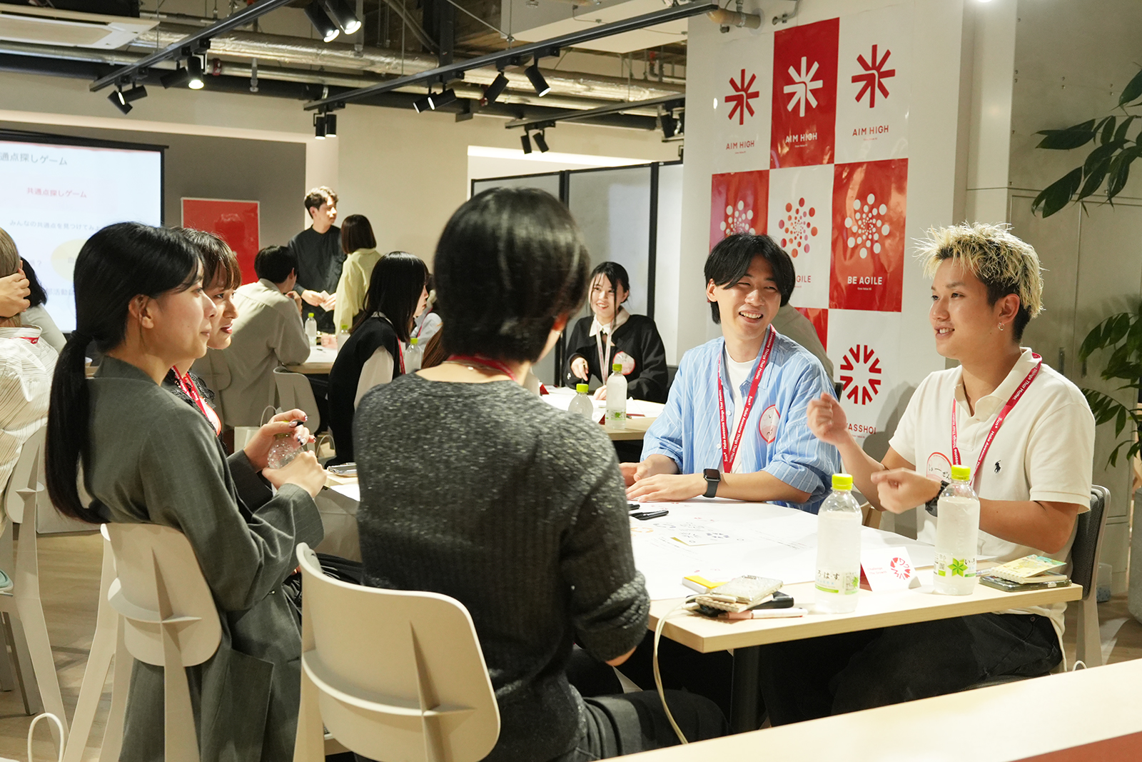 今年のアイスブレイクは「共通点探しゲーム」を実施しました。各チームで自由にお題を出し合い、全員に共通する項目を見つけていくシンプルなゲームです。たとえば「血液型」などのテーマで全員がA型なら共通点発見となり、最後はその内容にちなんだチーム名も決めました。