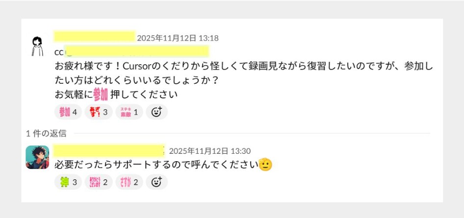 有志で集まって復習する会が行われ、Step3で追いつけなかったメンバーも、無事にCursorを使ったバイブコーディングができたそうです!