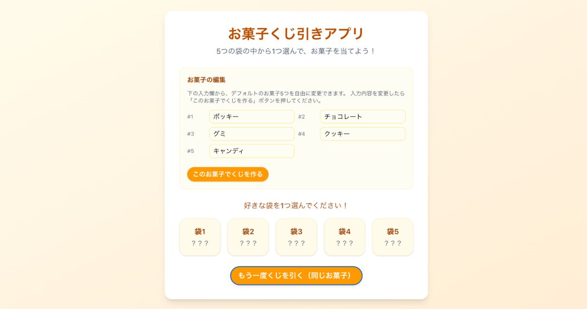 「景品のお菓子を決めるくじ引きアプリを作ってください。シャッフルされる5つの袋のうち一つを選択すると、選んだお菓子が表示されます。」