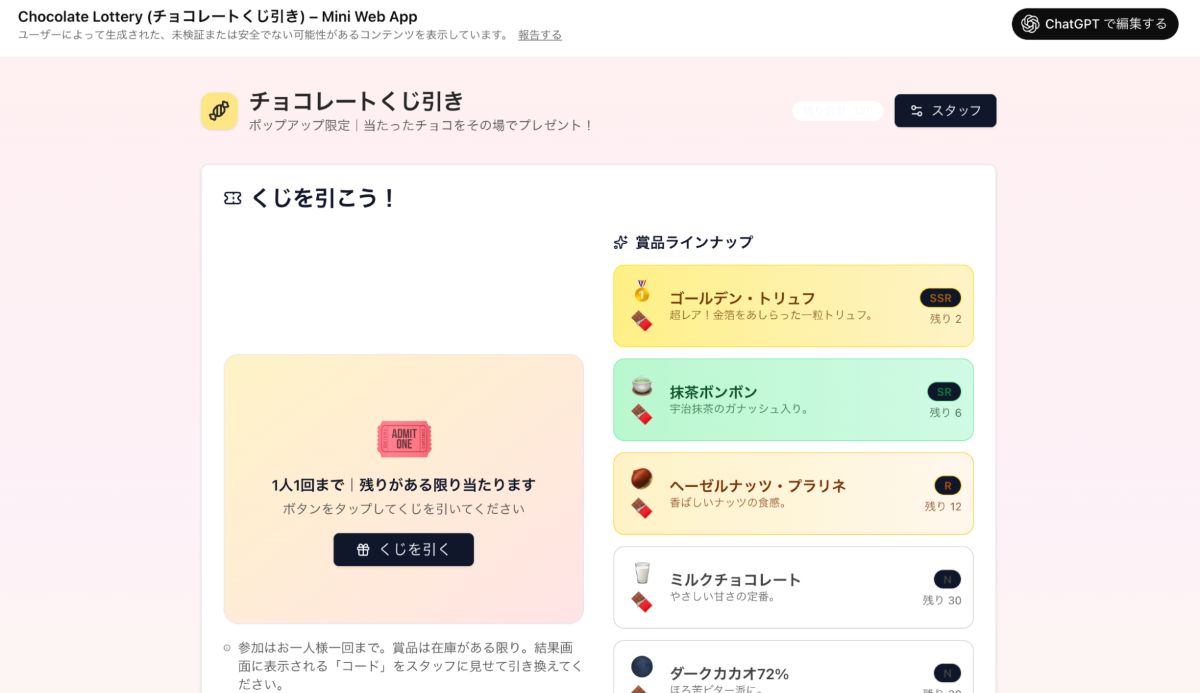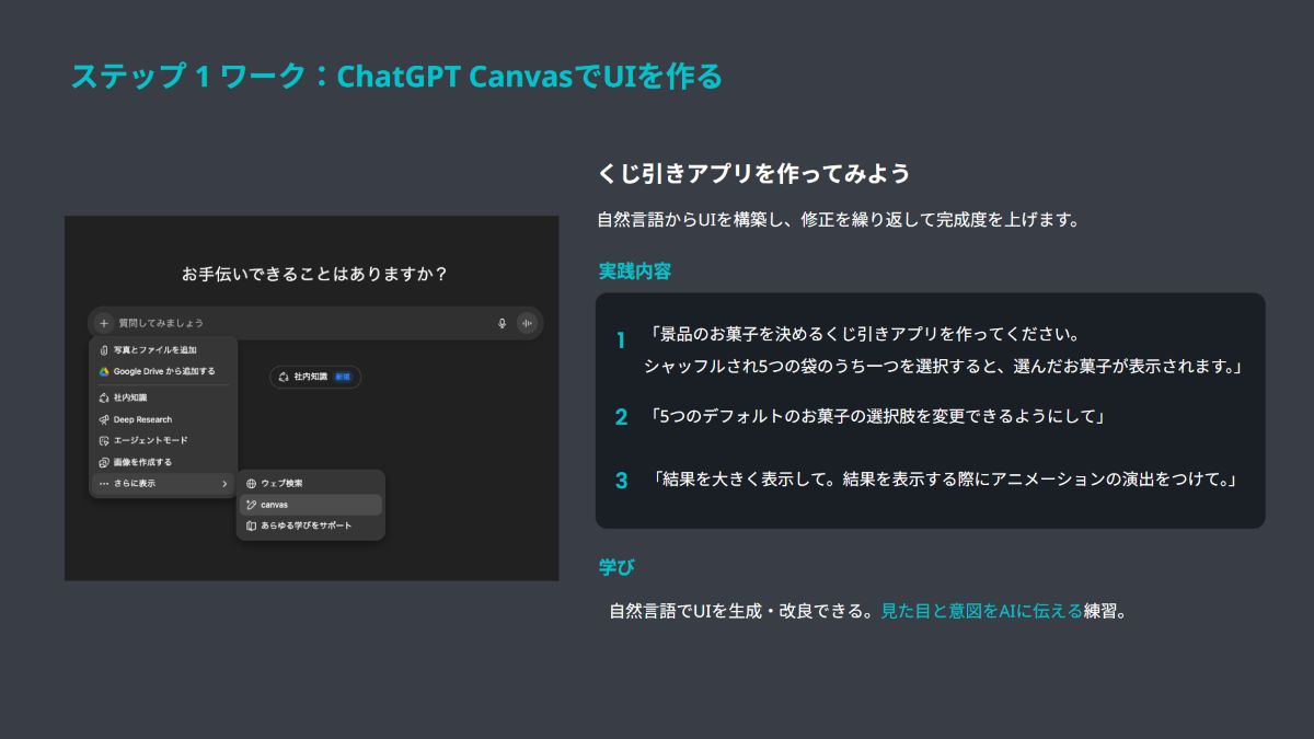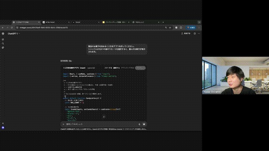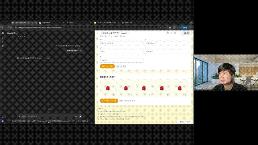 まずはChatGPTを使って、簡単なユーザーインターフェース(UI)を作ります。お題は「お菓子のくじ引きアプリ」。目に見えるプロダクトがすぐに出来上がる体験からスタートします。