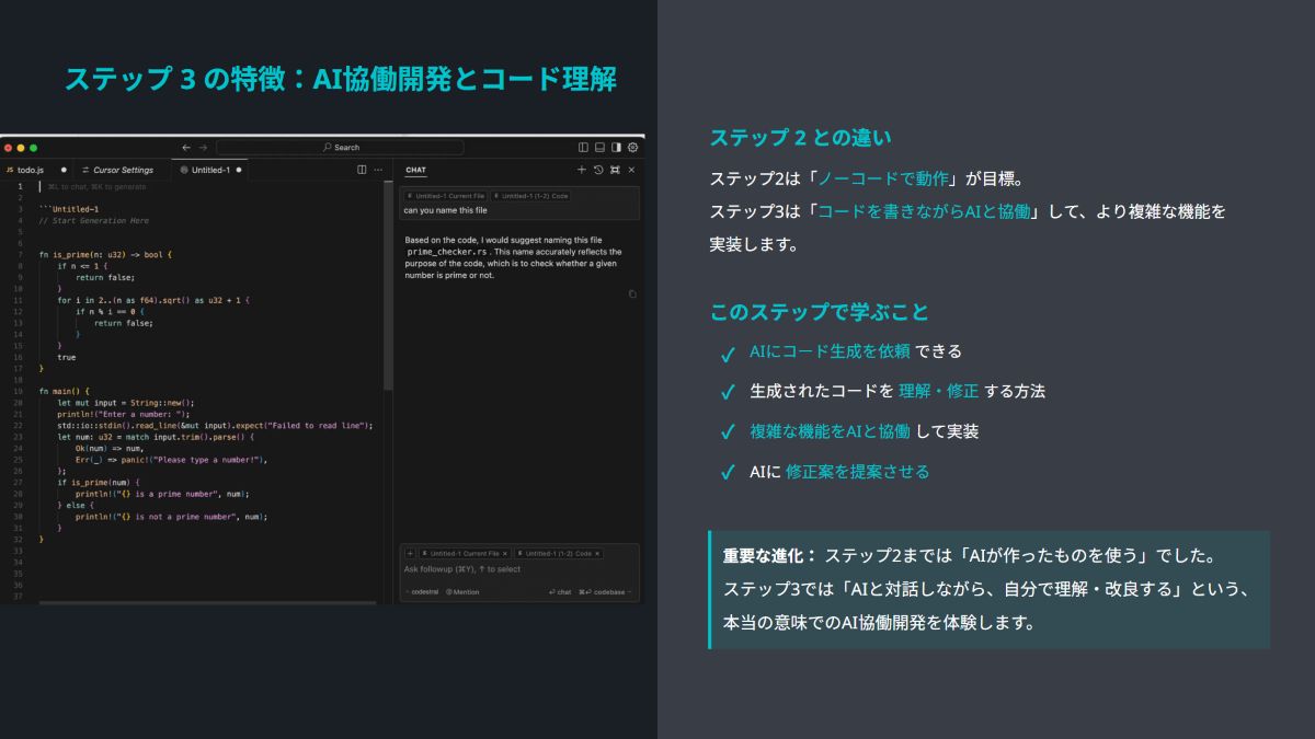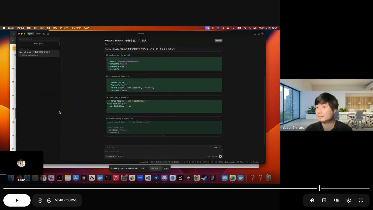 最後に、Cursorを用いてさらに複雑な機能を実装していきます。Cursorは、2.0へのアップデートでエージェントモードが追加されました。講師の白鳥によると、これによって、コードが読めない非エンジニアでも、チャットでの指示を通じて開発を進めやすくなったそうです。