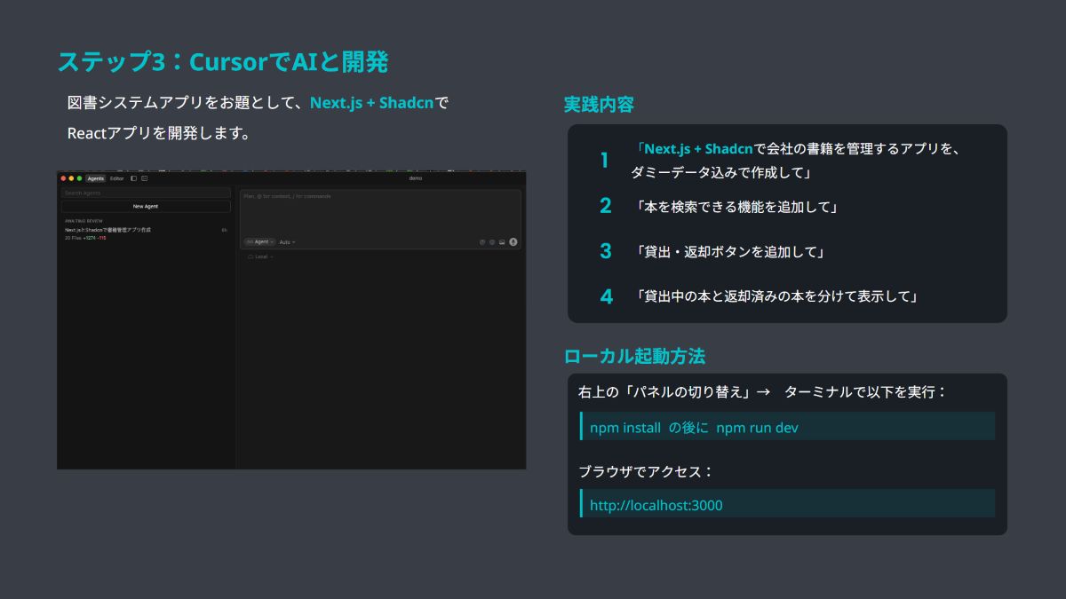 ローカル環境での実行やバックエンドの仕組みにも触れ、より本格的な開発フローを体験していきます。