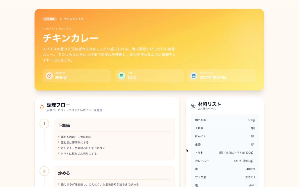 復習会では、Cursorを使った料理のレシピサイトのUIが作成されました↓