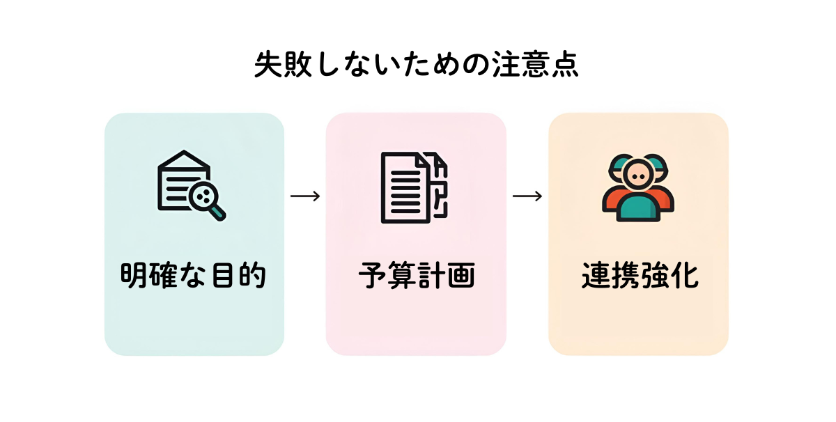 生成AIの導入では、目的が曖昧だったり、予算計画が不十分だと失敗につながるリスクがあります。ここでは、プロジェクトを円滑に進めるために意識すべき3つの重要なポイントを解説します。