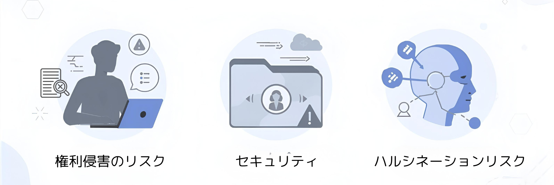 生成AIには、実際には存在しない情報をもっともらしく出力してしまう「ハルシネーション」という問題があります。誤った情報をそのまま業務に活用してしまうと、トラブルや誤情報拡散のおそれがあるため注意が必要です。生成AIが出力したデータは必ず一度人間が確認し、信頼性の高いデータかどうかを判断するフローを挟む必要があります。