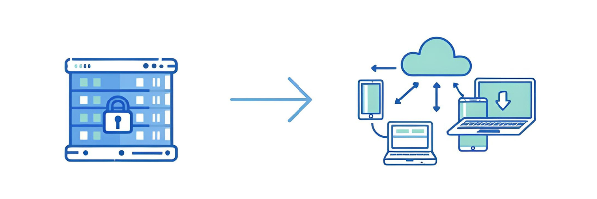 A. ブラウザ上で利用できるため、端末や場所を問わずアクセスできるようになります。リモートワークや多拠点運用にも対応しやすく、更新・保守の手間を削減できる点もメリットです。