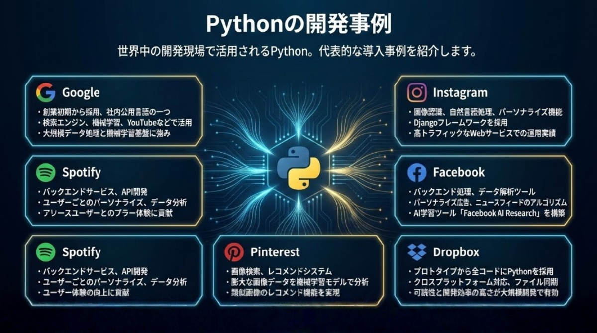 Pythonは、世界中の開発現場で使用されています。ここでは代表的な開発事例を紹介します。