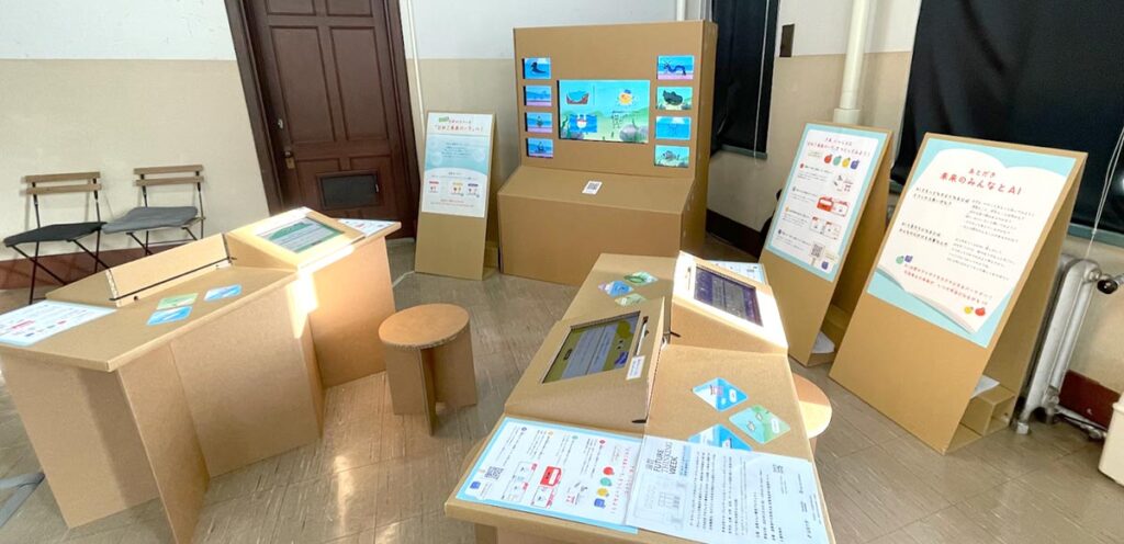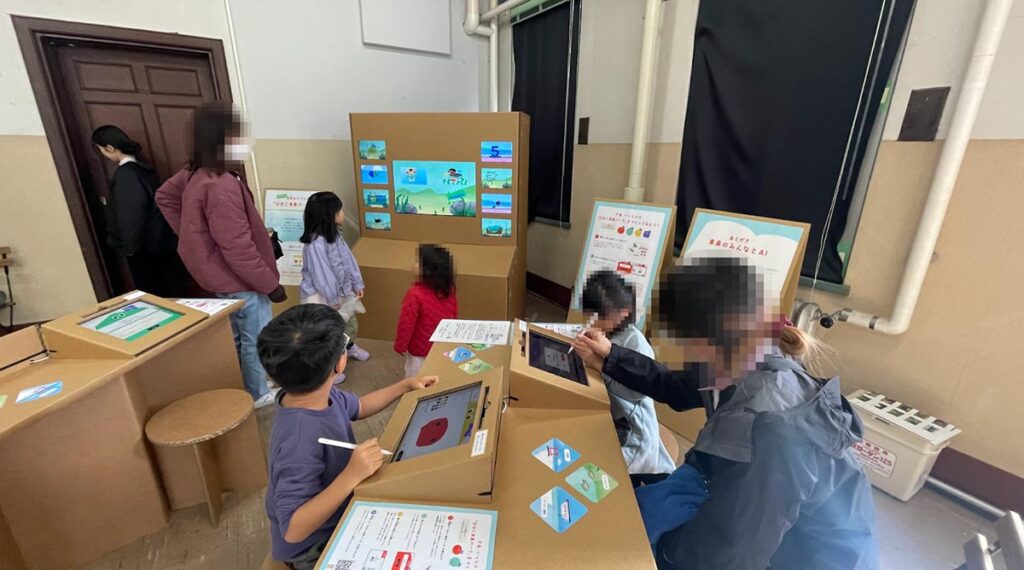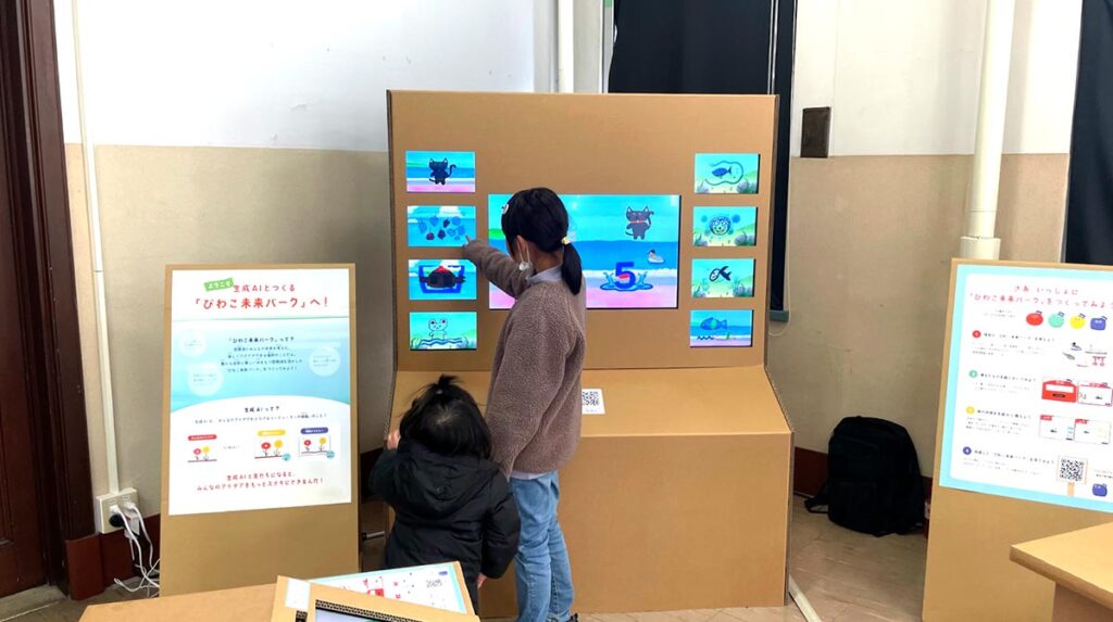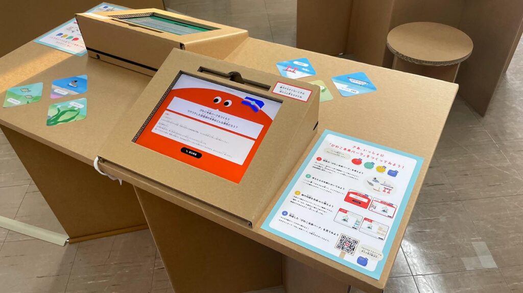 展示ブースの什器は、環境にも配慮し段ボールでオリジナル設計。一枚の大きなモニターを段ボールの枠で巧みに分割することで、複数の映像が動いているかのような演出を実現しました。子どもたちが使うiPadのカバーに至るまで、世界観を統一するための工夫を凝らしています。